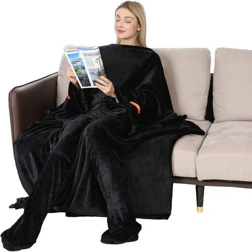 Winthome かいまき毛布 足・袖付き毛布 着る毛布 着るブランケット メンズ レディース 冷え対策 ソファー毛布 ロング丈 足まで全身カバー お昼寝毛布 防寒 保温 長着 大判サイズ 丸洗い 身丈190cm×横140cm 黒 125