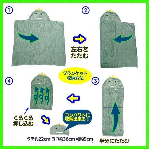 恐竜のブランケットはいろいろな使い方が出来る便利な万能タイプ! ①クッションや枕として②収納部分から出して広げるとブランケット、ひざ掛けとして ③フード部分をかぶって羽織ってアウターとして 使い終わった後は折りたたんで、くるっと丸めて恐竜の顔の部分に入れるだけだから、 収納もラクラク!コンパクト設計!携帯性抜群! 素材もふわふわモコモコで肌触りも抜群!とても気持ちよく使うことが出来ます!