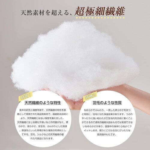 【肌触りなめらか ふんわり】布団表面は軽い起毛を施した桃の皮のようななめらかでやわらかい肌触りのピーチスキン加工を行います。柔らかい高級の繊維を使用するので、変なにおいがなくて、肌の敏感な方にも安心してお使い頂けます。掛布団中綿の極細纎維は、羽毛とほぼ同じ太さ、普通のポリエステル綿より軽くてふわふわで、まるで雲の中で寝ているような寝心地を実現します。