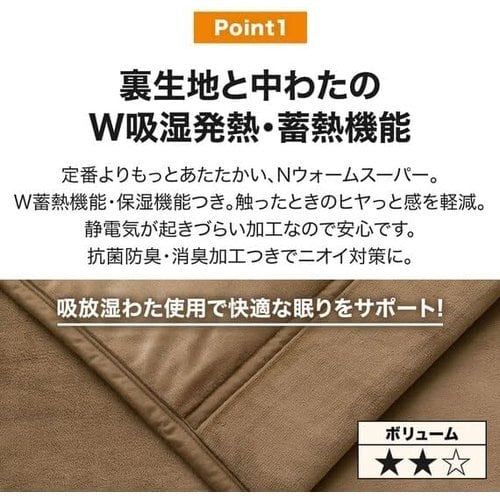 中わた入り2枚合わせ仕様で優れた保温力。えり元ふんわり中わた2倍。 裏生地と中わたの W吸湿発熱・蓄熱機能 定番よりもっとあたたかい、Nウォームスーパー。W蓄熱機能・保湿機能つき。触ったときのヒヤっと感を軽減。静電気が起きづらい加工なので安心です。抗菌防臭・消臭加工つきでニオイ対策に。 Nウォームスーパー Nウォームスーパー 中わた入り2枚合わせで 優れた保温力 手軽にあたたかさを。毛布だけでも、ふとんと一緒でも。えり元は中わたが2倍で首もとふんわり。 Nウォームスーパー ※画像はイメージです。 シングルサイズ 【ニトリの吸湿発熱(Nウォームスーパー)】えり・裏生地・充填物 ●えり元ふんわり中わた2倍 ●保湿(えり・裏生地) ●W吸湿発熱(えり・裏生地・充填物) ●W蓄熱機能(えり・裏生地・充填物) ●ヒヤッと感 軽減(えり・裏生地) ●吸放湿わた使用(充填物) ●静電気軽減(えり・裏生地) ●抗菌防臭(えり・裏生地) ●消臭(充填物) ●洗濯機で洗えます ■組成 表生地:毛羽 ポリエステル100% 地糸 ポリエステル100% 充填物:ポリエステル80%、合成繊維(アクリレート)20% えり・裏生地:毛羽 ポリエステル100% 地糸 ポリエステル65%、レーヨン35% ■洗濯機OK(ネット使用)