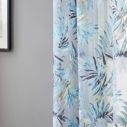 デザイン:南国の島を思わせる植物が、鮮やかに描かれたレースカーテンです。ブルーの熱帯葉がお部屋をさわやかな印象に。