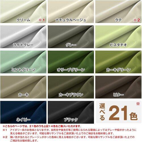 K-wave-D-eco100 plainのお色は全21色です。サイズは幅100cm・125cm・150cm・200cmの4サイズ×丈80cm~250cmの35サイズ、計140サイズご用意しております。