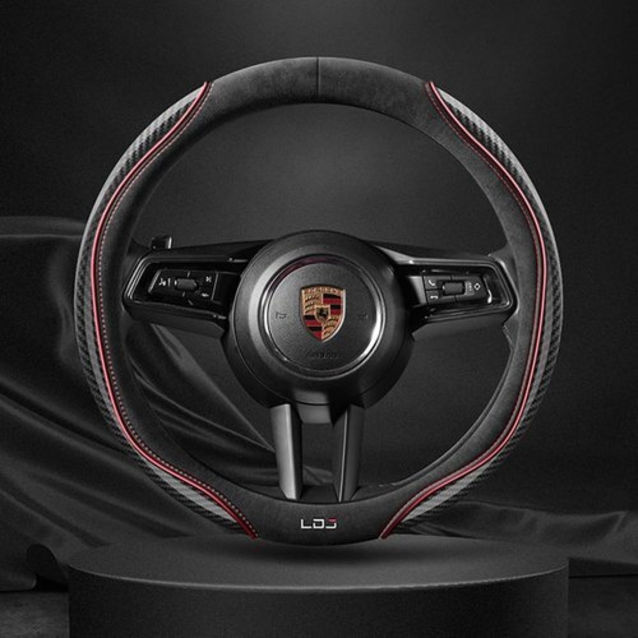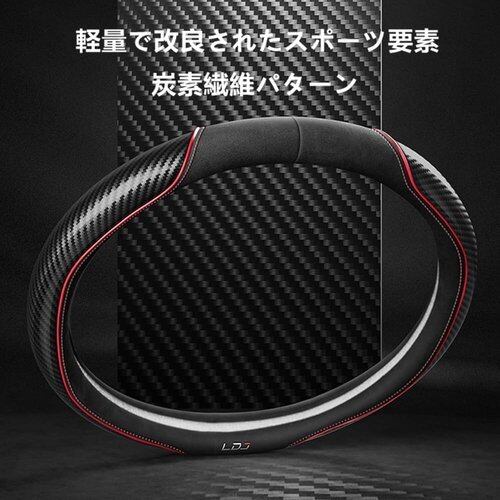 TATACLEA ハンドルカバー 軽自動車 乗用車 毛皮を変える 炭素繊維パターン ステアリングカバー滑り止めゴム内輪 四季汎用 通気性 握り 触感よく 耐久 滑り止め 汚れ防止 外径38㎝ O型 適用 スエードの赤い糸 311