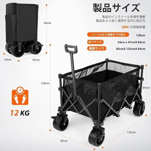 Kurumina キャリーワゴン 折り畳み式 キャリーカート アウトドア キャンプカート アウトドアワゴン ワイドタイヤ搭載 伸縮ハンドル 大容量200L 耐荷重200kg 自立式収納 BBQ 釣り 遠足 4輪 レジャー キャンプ 運動会に最適 387